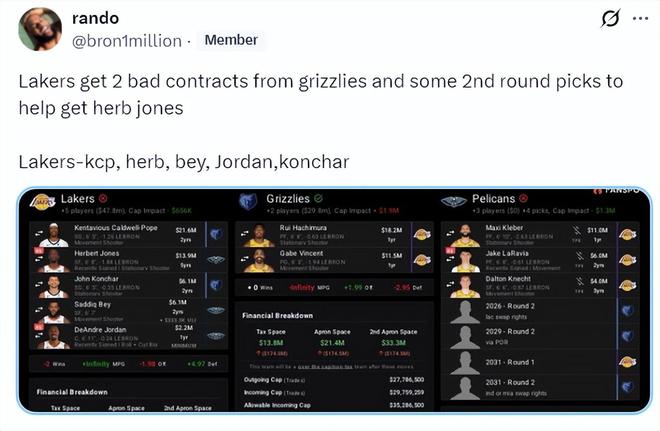 湖人球迷则建议拉入灰熊作为第三方,湖人只需要出一个首轮签足以: